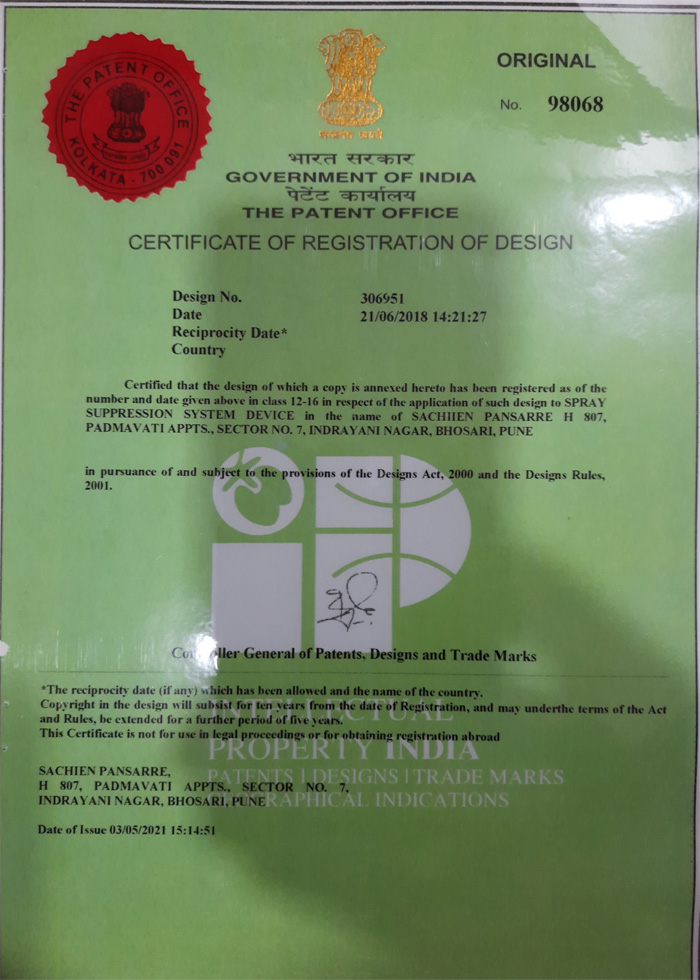 The design patent for Spray Suppression System / Device is registered by Mr. Sachiien Pansarre which is accepted and published in Journal in India. He has granted Patent by Intellectual Property, INDIA.